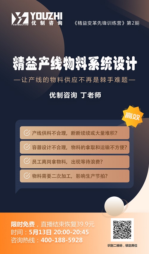 出現(xiàn)以上問題的主要原因之一,就是缺乏對產(chǎn)線物料供應系統(tǒng)的精益設(shè)計。如何做到既不影響生產(chǎn)節(jié)拍,又能保證產(chǎn)線的物料庫存水平維持在低位?5月13日晚20:00,優(yōu)制咨詢丁老師教你科學地設(shè)計精益產(chǎn)線物料系統(tǒng),讓產(chǎn)線的物料供應不再是棘手難題!
