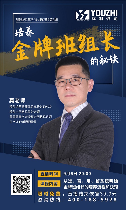 9月6日20:00-20:45,優(yōu)制咨詢莫老師幫您從選、育、用、留系統(tǒng)明確金牌班組長的培養(yǎng)流程和訣竅。