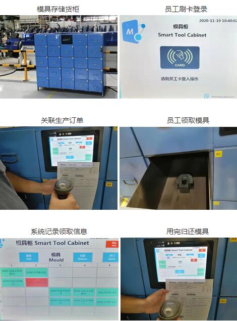 首先,員工通過刷卡登錄模具柜集成系統,然后掃描生產訂單,實現模具信息與生產訂單的關聯。在實現關聯后,模具柜打開,員工領取模具,系統提示領取信息,含領取人、領取時間及模具種類。在訂單生產完成進行報工時,系統提示歸還模具。此時系統將記錄模具的生產數據,實現壽命的跟蹤。